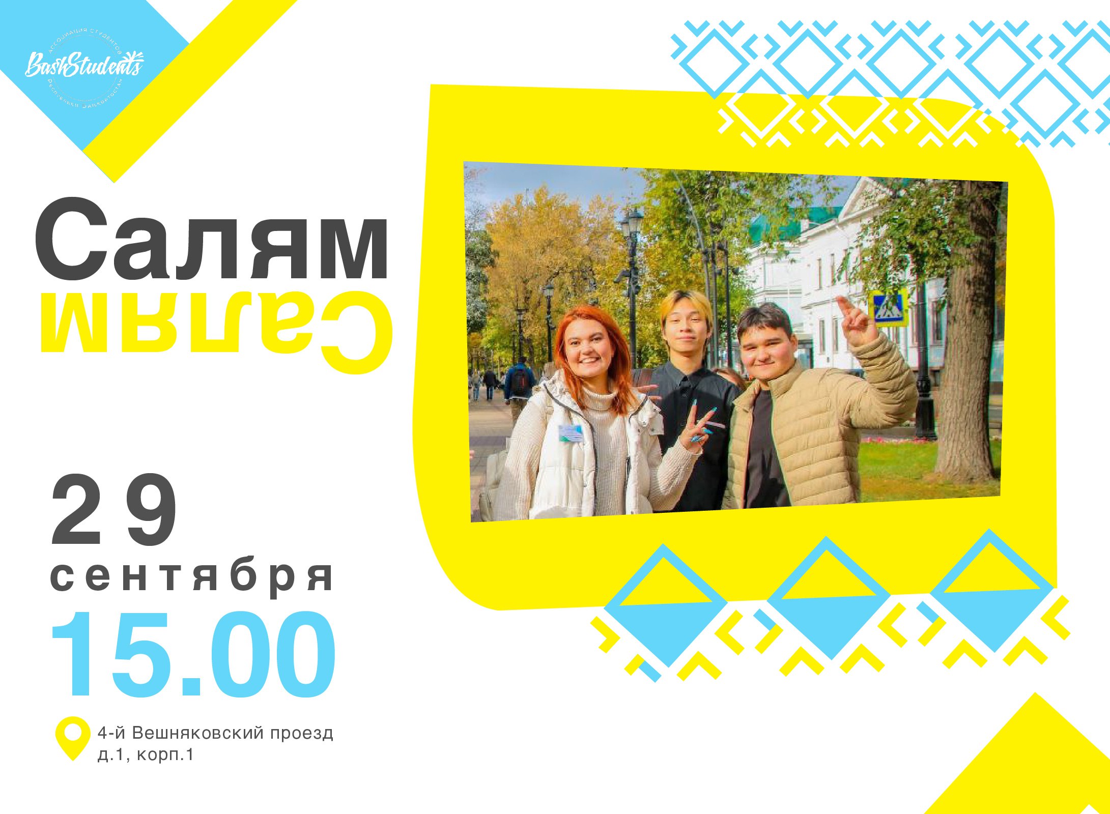 Мы рады приветствовать первокурсников, которые совсем недавно переехали в Москву и присоединились к нашей большой и дружной семье! Мы хотим ближе познакомиться и именно для этого приглашаем всех башкирских первокурсников принять участие в мероприятии "Салям", которое состоится